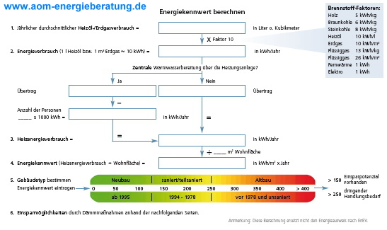 Mit dem nächsten Link haben Sie die Möglichkeit in vereinfachter Form den Energiekennwert Ihres Gebäudes selber zu ermitteln. Es lässt sich daraus das Energieeinsparpotential in vereinfachter Form bestimmen, anhand des Durchschnittswertes der jährlichen Brennstoffverbräuche aus den letzten drei Jahren: