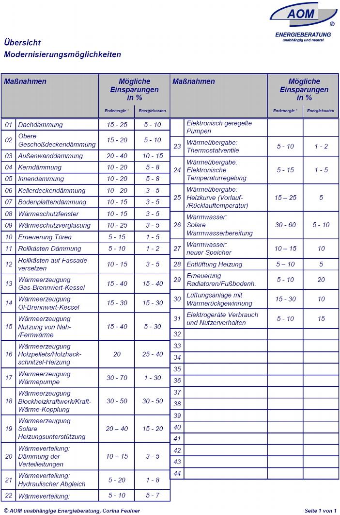 Hier eine Darstellungsübersicht aller möglichen Modernisierungsmaßnahmen und die Einsparungsmöglichkeiten in Prozenten in Endenergie und Energiekosten.